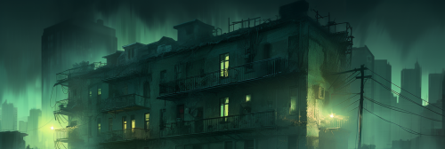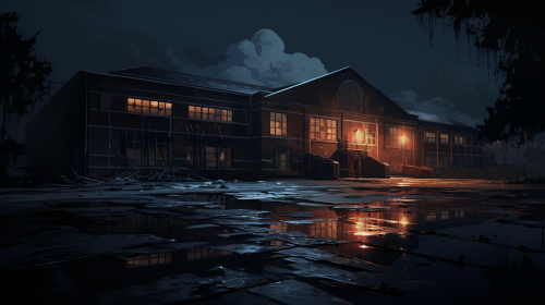 an abadoned elementary school at night, haunted by D&D shadow monster, new england at night, in the style of lovecraft, horror, illustration, concept art, Disco Elysium Style, electrochemistry disco elysium --ar 16:9