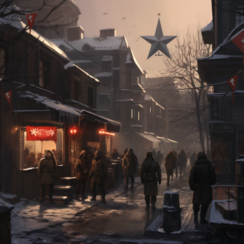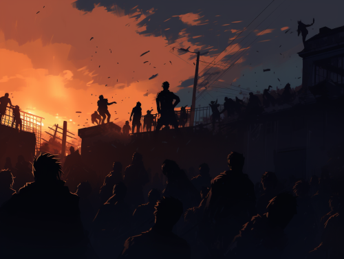 concept art, stylized, Disco Elysium Style, electrochemistry disco elysium, in the style of Aleksander Rostov,silhouette of Many Zombie horde running chasing as crazy, close up, on roof top of building in the city, close up, in mid century televition style --ar 4:3