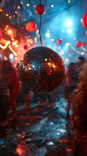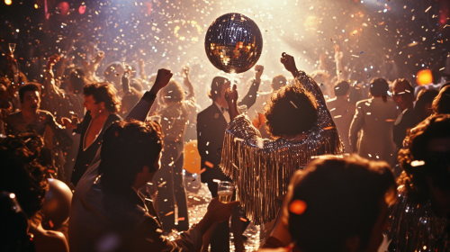 color photo of people celebrating at midnight during a disco themed new years party at Studio 54 in 1977, a single mirror ball, men in disco clothes dance with women wearing sequin fringe Mini Dress, Liberace pops champagne in the foreground, confetti falls from the ceiling, people blow noisemakers --ar 16:9 --style raw --v 6.0