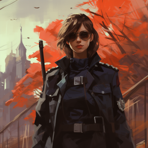 style of disco elysium, plain female police officer, baggy clothes, urban setting, axe, tomato, autumn