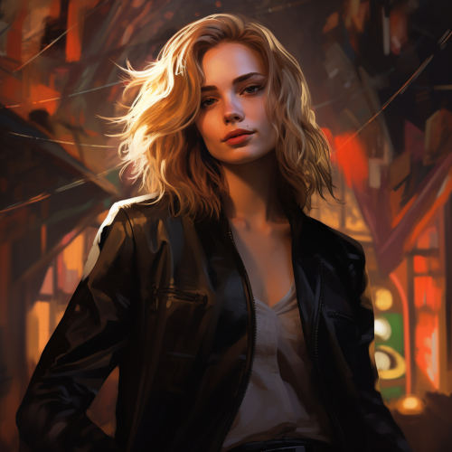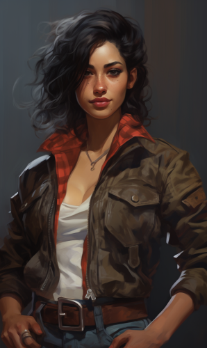 female ranchhand, hispanic, worker clothes, rustic, jeans, plaid shirt, leather jacket, inspired by Funcom's the secret world, science fiction, concept art, stylized, Disco Elysium Style, electrochemistry disco elysium, in the style of Aleksander Rostov, Portrait, --ar 3:5