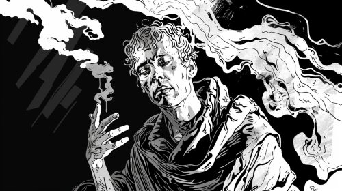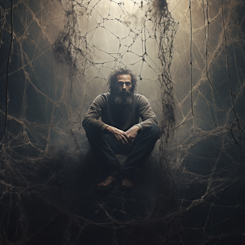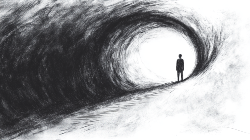 A rough, chaotic pencil sketch depicting a solitary figure standing at the end of a long, desolate path, symbolizing the final stop of life’s journey. The figure is small and hunched, surrounded by an overwhelming sense of solitude. In the distance, an abstract, darkened structure resembling a station looms, representing the final destination. The lines are jagged and rough, adding a sense of decay and inevitability to the scene. The background fades into darkness, emphasizing the finality and somber mood. The overall atmosphere is eerie and unsettling, capturing the quiet, profound moment of life’s end in a haunting, abstract style. --c 8 --ar 16:9 --v 6.1