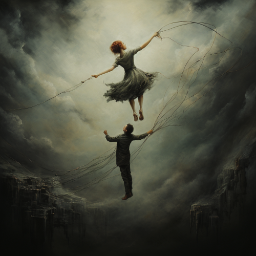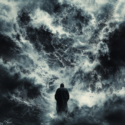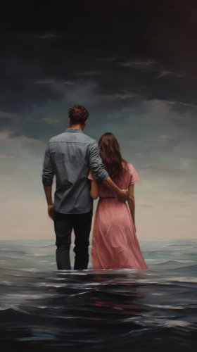 An image of a couple standing side by side, facing a stormy sea together, representing their unity in the face of life's challenges and uncertainties. oil painting. --ar 9:16