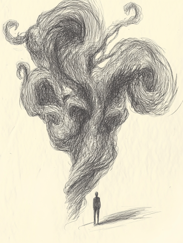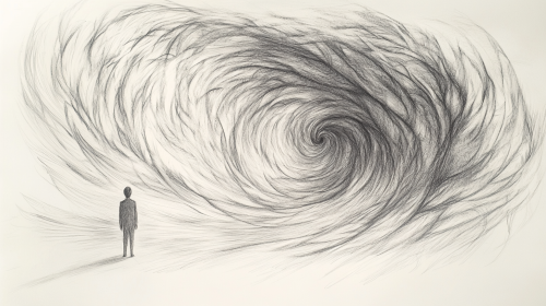 A rough, chaotic pencil sketch of a figure overwhelmed by an immense force of luck. The figure stands, small and fragile, as an abstract, swirling mass of luck looms over them, chaotic and overpowering. The shapes are jagged and rough, with lines spiraling in unpredictable patterns, creating a sense of tension and unease. The luck appears almost alive, pressing down on the protagonist who is dwarfed by its chaotic force. The scene is abstract, with rough strokes and erratic shading, giving it an eerie, unsettling atmosphere, like a mysterious drawing from an ancient, cryptic book. --c 8 --ar 3:4 --v 6.1