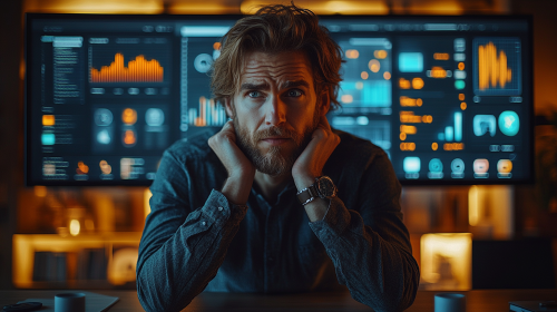 A frustrated business owner sitting at a sleek desk in a modern office, staring at a large computer screen filled with confusing social media metrics, graphs showing declining engagement, and warning notifications. His posture reflects stress, with hands running through his hair as he looks overwhelmed. In the background, blurred social media icons like a faded Instagram and Facebook appear as if slipping away, symbolizing lost visibility. The lighting is natural, with bright daylight streaming through large windows, casting a soft glow on the scene. Hyper-realistic style, ultra-detailed textures, 4K resolution, clean and professional atmosphere. --ar 16:9 --s 750