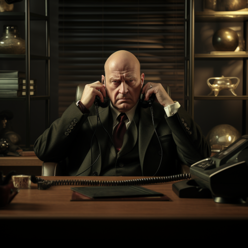 a 60 years old bald general manager full of fear and panic holding his telephone and sitting at his desk. He is at his office. Style: Vivid, cinematic, realistic, full hd. Size 16 wide :9 tall