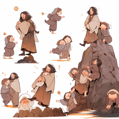 illustration of jesus and me, climbing together, multiple poses and expression, full body, kawaii character --niji 5