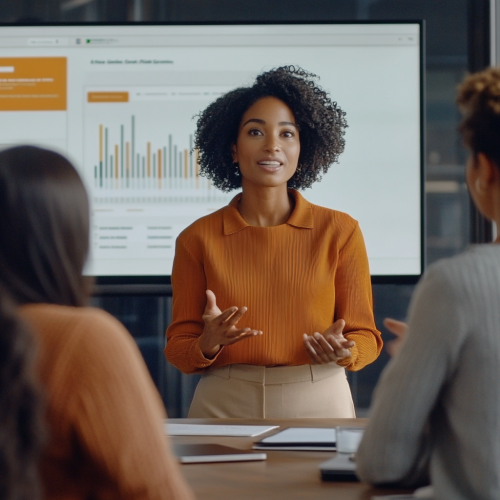 black woman with curly hair is presenting to her diverse colleagues in small group setting, screen shows sales engagement platform process for customer success practices