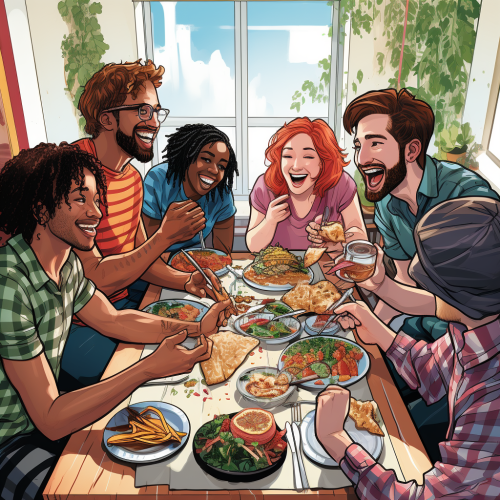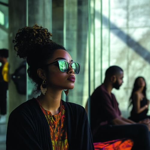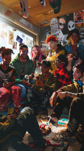 hd photo of a dynamic, urban-inspired scene featuring diverse individuals sharing stories through poetry and interviews. The backdrop should include a blend of cityscapes and creative spaces, symbolizing the intersection of culture, politics, and art that VAV Magazine captures.