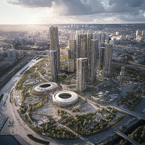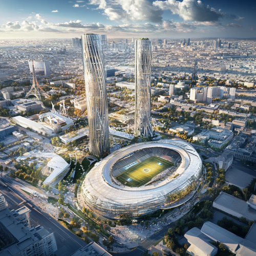 concept art for a new urban district in Paris, aerial view, urban planning, mixed use, museum, towers, urban landscaping, new PSG stadium, oval shaped stadium with translucent roof, new transit hub, La defense, the modern towers are inspired by the Eiffel Tower with exoskeleton structure