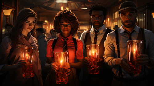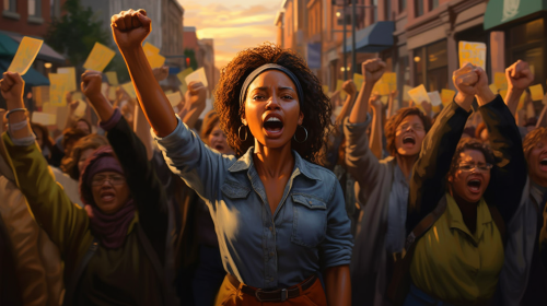 Inspiring black woman leading a peaceful protest in a photorealistic urban setting, carrying a powerful sign that advocates for equality and justice, surrounded by a diverse group of demonstrators, creating a sense of unity, empowerment, and social change ::2 solidarity, raised fists, impactful slogans, collective voices, determined expression, social transformation, inclusive community --ar 16:9 --s 250 --v 5.1