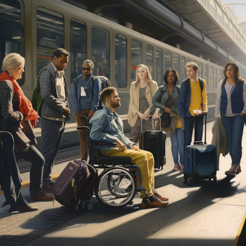 diverse set of transit riders, with luggage, some in wheelchairs waiting at a train station, lower view, photo realistic, v--6