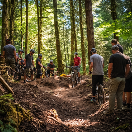 A group of volunteers working together in a forest, building a mountain bike trail, with moments of laughter, shared knowledge, and mutual support. The scene captures the warmth and camaraderie among them as they form lasting bonds. In the background, a sense of accomplishment fills the air as they proudly stand atop the newly built trail, watching as a few test riders enthusiastically descend the path, their bikes kicking up a trail of dust behind them. The scene is filled with joy, pride, and a sense of community