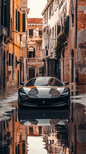 A Ferrari Roma cruising through the narrow, winding streets of Venice, with reflections of historic buildings and canals glistening on its sleek body. --ar 9:16