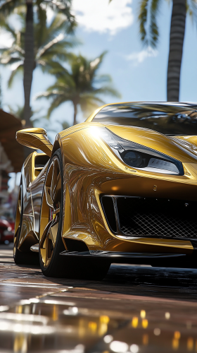 A close-up of a rich gold Ferrari 488 Pista, captured from an elevated angle, focusing on the distinctive air intakes and headlights. The luxurious finish of the car glimmers in the sunlight. The background is a softly blurred landscape of a lavish resort with palm trees and a clear blue sky, emphasizing luxury and relaxation. Highly detailed, photorealistic with resort view, 8K resolution --ar 9:16 --v 6.1 --style raw