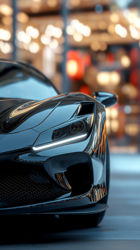 A close-up shot of a sleek black Ferrari F8 Tributo, highlighting its elegant curves and intricately designed headlights. The shiny surface of the car captures reflections of the upscale surroundings, emphasizing its luxury status. The backdrop includes the blurred outline of a high-end boutique, conveying an atmosphere of exclusivity and refinement. Ultra-detailed, photorealistic with boutique backdrop, 8K resolution --ar 9:16 --v 6.1 --style raw