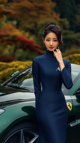 A young Japanese woman with her hair in a neat updo poses confidently beside a striking green Ferrari California T. She is dressed in an elegant navy blue gown with a fitted bodice, exuding sophistication. With one hand on the car's door and the other gently touching her neck, she looks towards the camera with a captivating smile, set against a backdrop of a beautifully landscaped garden. Photorealistic, ultra-detailed with garden backdrop, 8K resolution --ar 9:16 --v 6.1 --style raw