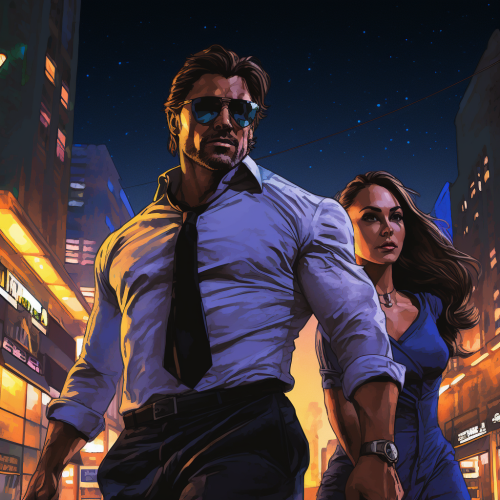 pulp adventure magazine style illustration of a lean rugged muscular billionaire with his supermodel wife on his arm walking through the streets of dubai at night