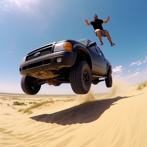 2004 black lifted ford ranger supercab Edge, jumping a dune , in a desert, in the summer time, real footage, realistic, old GoPro, windy, 8 feet in the air, crazy, 30 feet away --v 5.1 --s 750