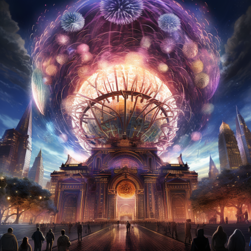 Generate an image of a colossal monster ascending the iconic New Year's Eve ball drop building, with the city skyline below illuminated by a dazzling array of fireworks and lights. This scene should exude a sense of wonder and adventure, with the building's architectural details and the monstrous climber taking center stage, creating a visually stunning and thrilling composition."