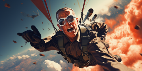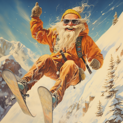 an old jolly haggard skier catching air off a cliff spread eagle and a smile on his face in an ethierial style
