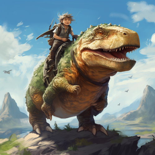 you're on a thrilling adventure in a prehistoric world, halfway through your journey, when suddenly, you stumble upon a clever lemming rodent riding on the back of a towering T-Rex dinosaur.
