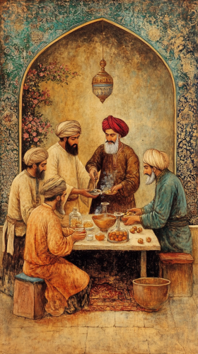 an ancient persian painting of a group of ancient persians making health remedies. they are beautiful and in an ancient persian environment in the style of an ancient persian PAINTING --ar 9:16