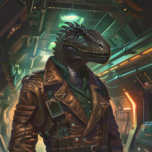 a charismatic and intimidating reptilian draconic vesk humanoid with black scales and head spikes and glowing green eyes wearing a brown leather duster standing in a starship cargo bay. Graphic novel.