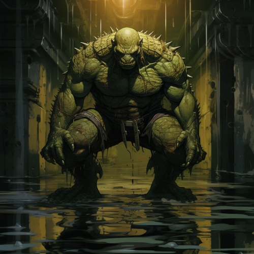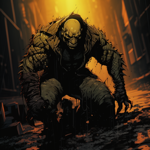 full body Seinen anime art style of DC comics Cyberpunk Killer Croc, cell shading, natural lighting, natural shading, dynamic action pose, background is the sewers under Gotham City, depth of field, style 1000, v 6.0, 28:10