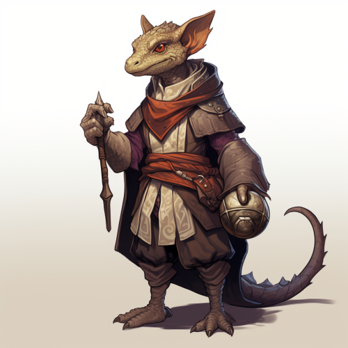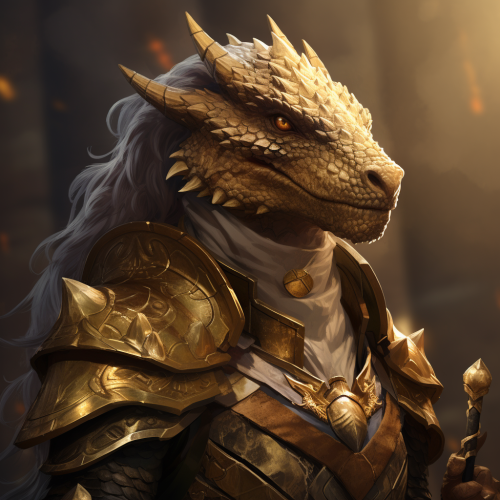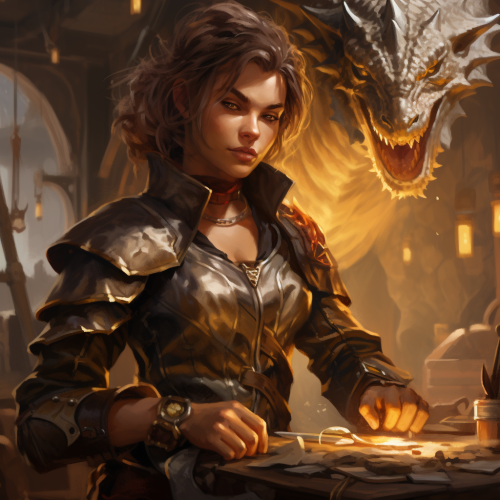 a golden scaled dragonborn smith with no hair and wearing sturdy leather clothing, her gaze fixed on the sword she is crafting in a sophisticated looking smithy. Lightning crackles around her hammer, a symbol of her draconic heritage. Using the Forgotten Realms setting