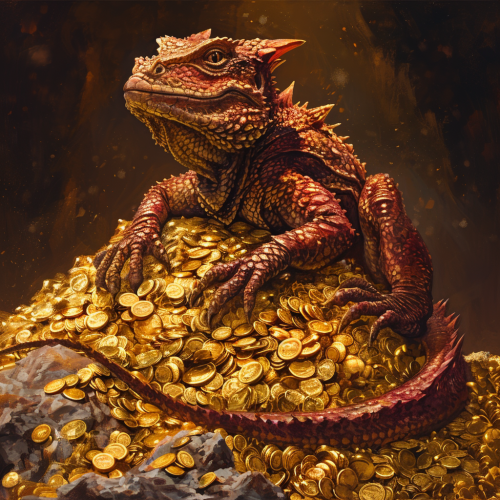 a draconic darkred lizardman sitting atop a pile of gold --v 6.0