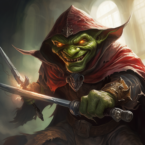 goblin fighter wizard with a rapier and a magic wand, red clothes, green skin, pointed teeth, smiling, carefully exploring a fantasy sewer, in the style of D&D
