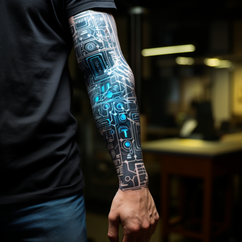 a colorful biomechanical tattoo sleeve, that has yellow intricate blade-like structures that flow around the arm. The background of the design should be an organic alien substance. Make it in the style of Guy Aitchison.