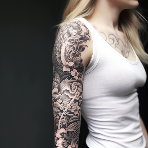 a vector greyscale arm sleeve tattoo design that is 80% simple elegant lace. It will include simple floral Accents and small flying dragon silhouettes.