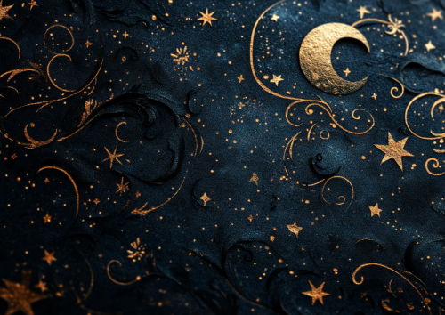 A black and gold paper diorama model of the night sky with stars and a moon against a dark blue background, with small golden accents on top of ornate scrollwork. The art style is fantasy-inspired, with a detailed character design that is inspired by vintage illustrations. The overall effect is a highly realistic watercolor painting. --ar 97:69