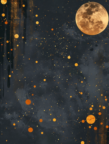 Minimalist flat illustration of a starry sky, with dots and stars, and a moon in the upper right corner. The background is a dark gray with golden foil, and the dots are glittering in yellow and gold. --ar 16:21 --v 6.0