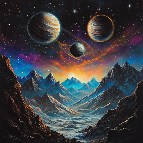 Alien night sky, two moons, one silver, one gold, nine shimmering planetary rings, above majestic mountains, with scattered stars twinkling, ultra-detailed, depicting a captivating celestial landscape, mysterious and enchanting, vivid colors, highlighting contrasts of light and darkness.