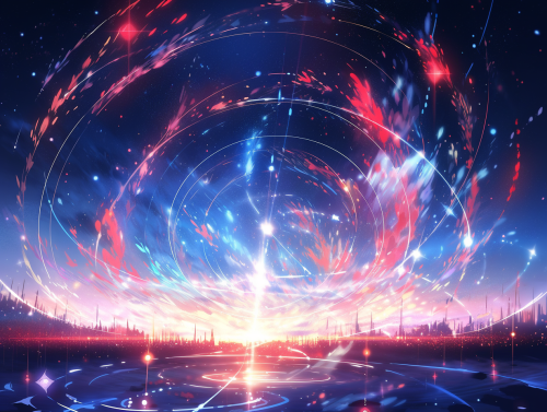 an enchanting night sky showcasing a red star and a blue star in close orbit, their light trails intertwining like a dance of past and future, shimmering particles of red and blue mingling to form delicate constellations, gentle glow casting ethereal reflections, in a detailed anime art style with a dreamy atmosphere, --ar 4:3 --niji 5