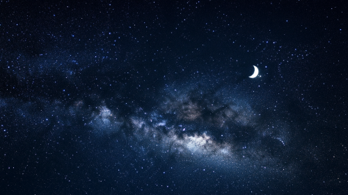 A night sky filled with stars and a glowing Milky Way, with the faint outline of a crescent moon adding to the celestial scene. --chaos 5 --ar 16:9 --style raw --v 6.1