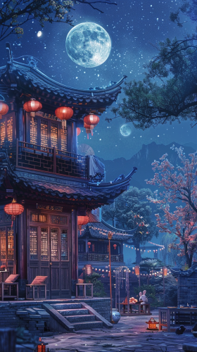 zhongqiu,night,sky,moon,night sky,lantern,east asian architecture,star (sky),outdoors,open mouth,rabbit,paper lantern,tree,smile,starry sky,furry,architecture,full moon,looking at viewer,flag,fireworks,Mountains,water,rivers,reflections,shadows,stone chairs,Tree,flower,table,mooncake table,door,window,eaves --aspect 9:16 --v 6.0