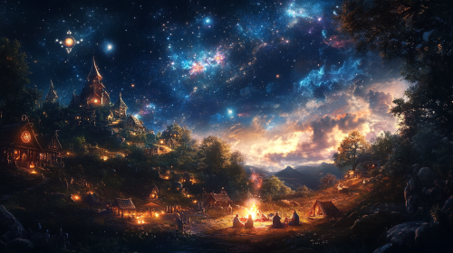 a galaxy night sky scene filled with stars, and star signs in the sky, below is a calm village with people sitting around a camp fire telling stories. --ar 16:9