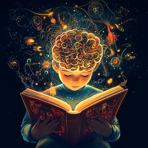An illustration of a child reading a book, with the book's pages transforming into a glowing brain filled with intricate patterns and symbols representing language, creativity, and critical thinking, highlighting the cognitive benefits of reading.