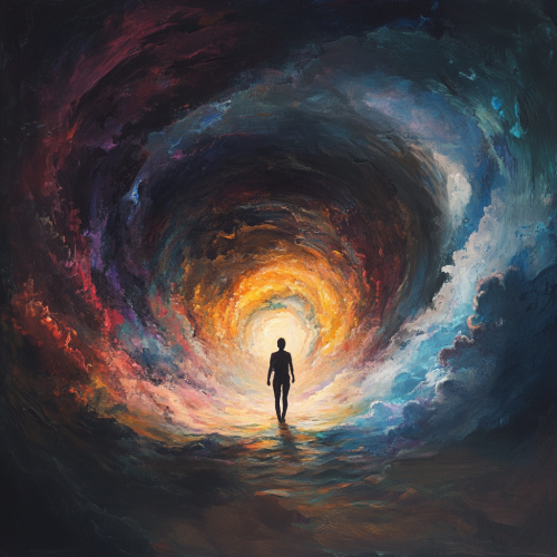An abstract representation of transforming anxiety into grounded confidence. Begin with a person standing at the edge of a dark, swirling vortex symbolizing anxiety--an entanglement of fear and uncertainty. The figure appears apprehensive, with one foot hesitantly stepping forward. As the scene progresses, the darkness gradually gives way to light and vibrant colors, symbolizing confidence emerging. The figure becomes more defined and upright, surrounded by glowing symbols of strength, capability, and worth. The final scene depicts the person confidently walking towards a bright horizon, leaving the remnants of anxiety behind, now turned into anticipation and determination. The background shifts from a stormy sky to a clear, calm, and bright landscape, embodying the journey from fear to empowered confidence.