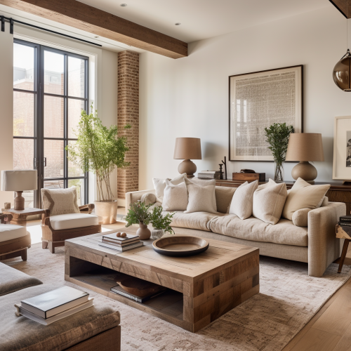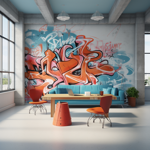 Graffiti painted on a wall in an office with realistic drawing of furniture, home and decoration design. Predominantly more neutral colors but also some other colors. Bring the space to life.