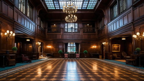 Photo of a grand interior hall that reflects a classic and elegant aesthetic, indicative of a traditional institution such as a private club, library, or meeting room within a prestigious entity. The spacious hall boasts a 4-meter-high ceiling adorned with subtle spotlights and visible beams contrasting against dark wooden paneled walls with a glossy finish, reflecting soft light from hanging chandeliers and golden wall sconces. The floor is laid with light stone tiles, subtly veined, and covered with large Persian rugs in intricate patterns of yellows and blues. Furnishings include dark leather Chesterfield sofas and wingback chairs, wooden tables, and chairs on the right side for reading or meetings, suggesting a serious and solemn atmosphere. Portraits framed in gold of significant figures line the walls, with wall sconces aligned to highlight these artworks. Ornate classic tapestries and textiles hang from the walls, adding depth and texture. The symmetrical arrangement of furniture creates conversational zones and clear walkways, with an open space in the center indicating the hall's use for social events, receptions, or formal gatherings. The overall ambiance is one of luxurious tradition, grandiosity, and formality, with a careful selection of furnishings and accessories. --v 5.2 --ar 16:9 --style raw --chaos 10