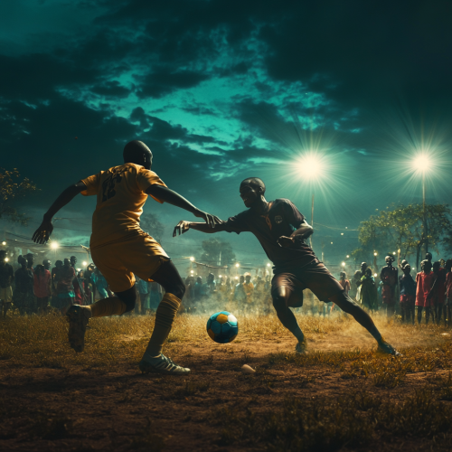 Create a surreal dreamscape of two soccer players fighting for a soccer ball . Show the soccer field and a group of people observing. Make the ball dark blue and gold. Ensure the floodlights are showing. Make the environment an african themed environment.