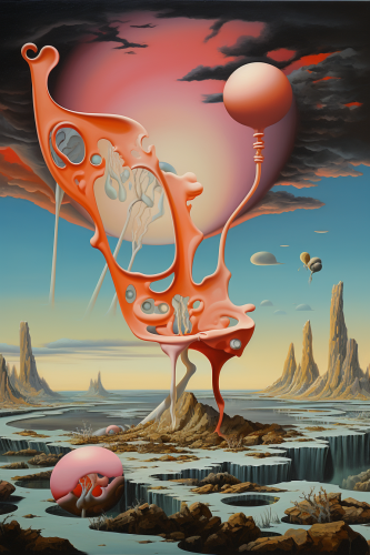 dystopian dreamscape painted in surreal art style combined with minimalism and contemporary art by Salvador Dali and Rene Magritte, intricate color palette, artistic, bizarre, precisionism influence,dynamic balance, --ar 2:3