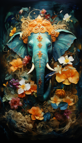 ecstatic dreamscape, lord ganesh lush happy, calm, mixed media --w 10 --ar 4:7 --s 250 --style raw
