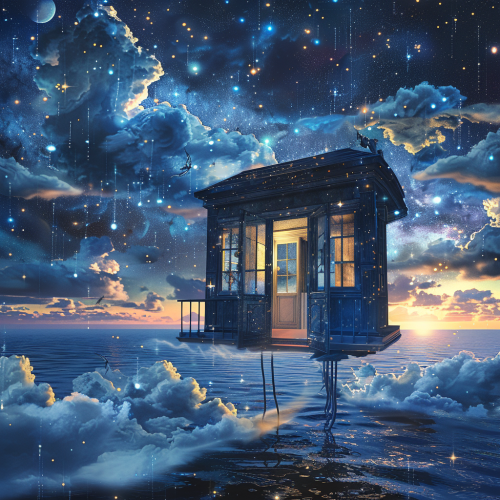 A floating cabin suspended between the stars and the ocean, its walls transparent and filled with shifting galaxies, with the floor made of clouds and the door opening into infinity, representing the intersection of dreams and reality. Art Style: Surreal Dreamscape --v 6.0