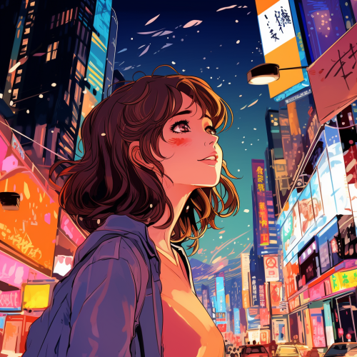 Create an illustration representing the first scene of "Midjourney". It should showcase a young woman named Lily, waking up in a vibrant and bustling city corner surrounded by tall buildings and flowing traffic. The city should be colorful and dynamic, with neon signs and busy city dwellers. Lily should look confused and lost, her surroundings should feel overwhelming, reflecting her state of mind. In the foreground, have some dynamic elements like walking pedestrians and fluttering newspapers to represent the liveliness and vibrancy of the city.